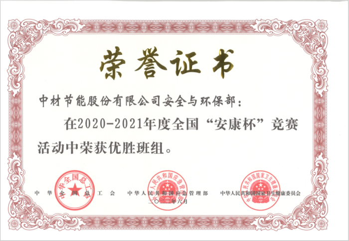 中材節能安全環保部獲2020-2021年度全國“安康杯”競賽優勝班組榮譽稱號