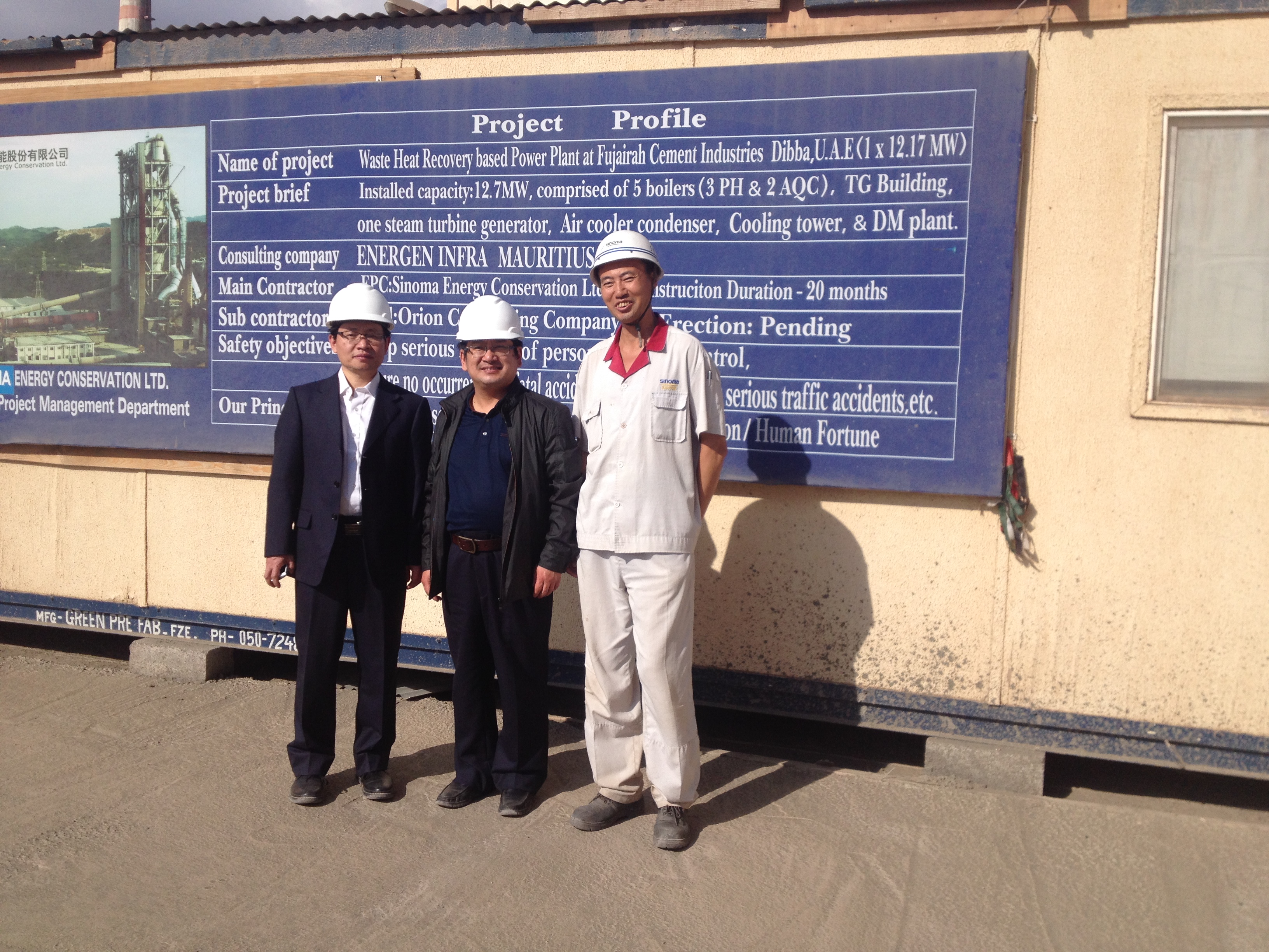 第二天,葛立武又抵達(dá)阿聯(lián)酋另一個(gè)項(xiàng)目部--Fujairah水泥廠。在該公司葛總會(huì)見了Fujairah水泥廠的總經(jīng)理Mhd. Khammas先生及余熱發(fā)電負(fù)責(zé)人MUTHTY先生。該余熱發(fā)電項(xiàng)目為2013年簽訂的EPC總承包項(xiàng)目,裝機(jī)12MW,目前多個(gè)子項(xiàng)目工程已經(jīng)具備安裝條件,設(shè)備也已陸續(xù)進(jìn)場(chǎng)。該項(xiàng)目負(fù)責(zé)人MUTHTY先生對(duì)中材節(jié)能項(xiàng)目團(tuán)隊(duì)的工作給予了高度的評(píng)價(jià),并希望雙方再接再勵(lì),爭(zhēng)取做到工期提前,盡早并網(wǎng)發(fā)電。葛總表示,項(xiàng)目的安裝和質(zhì)量是生命,在保證安全及施工質(zhì)量的前提下,項(xiàng)目部要倒排工期,爭(zhēng)取早日并網(wǎng)發(fā)電,為業(yè)主早日創(chuàng)造收益。