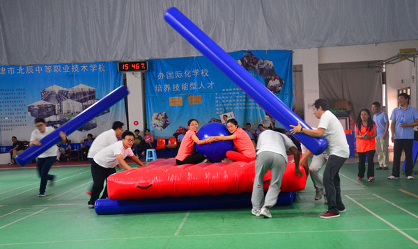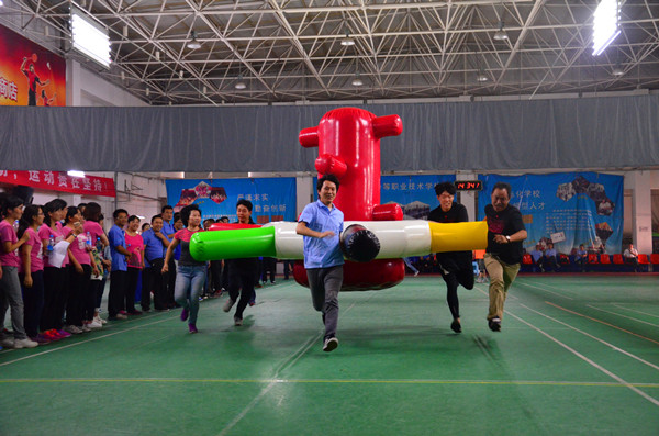 比賽高潮一浪高過一浪。車輪滾滾項(xiàng)目比賽把賽事推向了最高潮,該項(xiàng)比賽不僅拼速度,拼協(xié)作,還要拼認(rèn)真細(xì)致。2人坐在氣墊上面保護(hù)氣球不掉下去,4人往前推氣墊前行,2人還要不停的抽換柱子(相當(dāng)于車輪),如果配合不好,要么氣墊著地,要么車輪變換不及,要么氣球會掉下氣墊。最終技巧與配合默契的設(shè)計(jì)二隊(duì)獲得該項(xiàng)比賽的第一名。